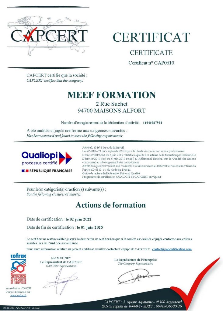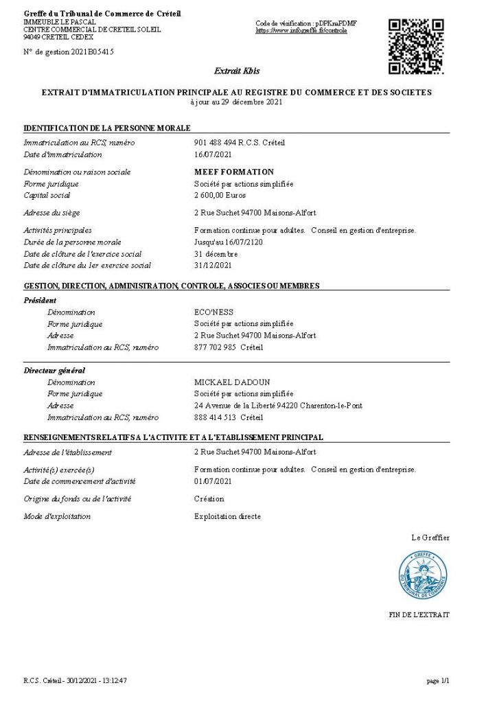 , garantissant la qualité de nos formations professionnelles conformément aux normes du Ministère du Travail français. Cette certification nous permet d’accéder à des financements publics et de renforcer la crédibilité de nos services. En outre, notre extrait Kbis